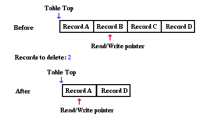 that two records be deleted. Before the deletion process the read/write pointer is at "Record B"