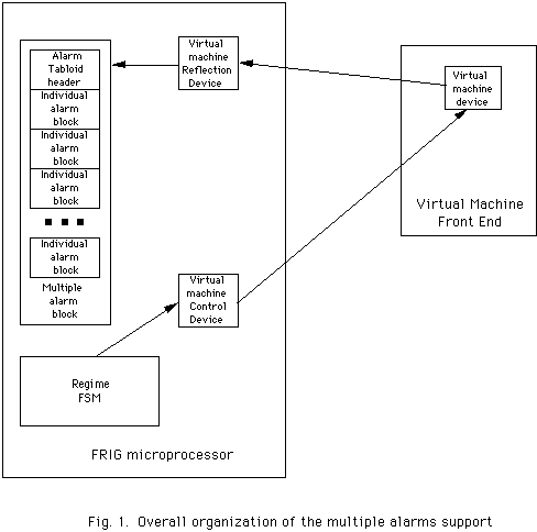 Several changes have been made to support multiple alarms in the FRIG micro. Two new types of devices were introduced: Virtual machine control and virtual machine reflection. Virtual machine control device comprise two devices - primary and secondary. Secondary device is used for establishing of the link to the Virtual machine FE. It supports 3 data base properties : setting - setting of the DI of the Virtual machine FE device, to which it will be connected, reading of setting - reading set information back, and basic status, acknowledging that the setting to the device has been done. Primary device is used for the setting of the regime itself. It can be set either externally (from parameter page or specialized application) or internally by FRIG software, for example, by the dedicated FSM. When this device receives setting it sends message (via proprietary protocol) to the Virtual machine FE. This device allows to facilitate internal intelligence in FRIG micro, that makes the decisions about state (regime) change. The Database properties, supported for this device are setting - setting of the current regime, reading and reading the setting, that are returning this set value and basic status - the same as for secondary device. The Virtual machine FE, when it receives regime change message, checks it for correctness, and if it is in fact correct, besides doing other things, does the setting to the virtual machine reflection device. The virtual machine reflection device is the one that really controls alarm block changing. In the current implementation we are supporting up to 64 virtual machine control devices and up to 64 virtual machine reflection devices. This framework is flexible enough to provide both internal and external regime switching and inter node communications.