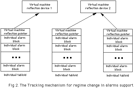 Multiple alarms support is achieved by replacement of the alarm blocks by alarm tabloids, each containing 16 alarm blocks (digital or analog), thus allowing to support up to 16 different alarm blocks per device/property inside FRIG. Every tabloid has a pointer to the virtual machine reflection device, by which it is controlled. This hierarchical scheme is established in the Database, by introducing additional property - PRVMDI. For given device this property defines Virtual Machine FE device controlling it and the set of the controlled properties (Analog Alarms, Digital Alarms, Settings, etc.). Given Virtual machine FE device, it is possible to query Virtual machine FE to determine Virtual machine reflection device for the given node, that actually fulfills local regime control. This hierarchy can be downloaded into the microprocessor either by using Frigboot (Database download) or specialized alarm viewer application (D67). D67 also allows for queering this hierarchy from the FRIG microprocessor. Specialized proprietary protocol is used to support downloading and read back of hierarchical information. Each time, when alarm scan is fulfilled, the value of the virtual machine reflection device is obtained and this value serves as an index into array of alarm blocks for this particular tabloid. The virtual machine reflection device itself, in this implementation, doesn't have to know about alarm tabloids it is controlling. This allows to have connection pointers only in tabloids themselves and eliminates necessity of maintaining the linked list of tabloids, belonging to each particular virtual machine reflection. The overall regime tracking mechanism is shown on FIG. 2.